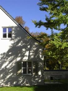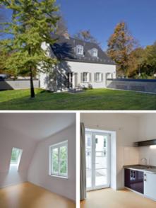 ![]() | Sanierung des kleinen Gärtnerhäuschens Als Solitär mit steilem Satteldach steht nördlich der großen Anlage das Haus Nr. 32. Das Gemäuer aus Ziegel im Klosterformat, der historische Dachstuhl und das wild-romantische Gartentor lassen vermuten, dass es sich bei dem Gebäude um ein Relikt handelt, als damals auf dem Areal noch 2 Schlösser mit See standen. Die Erhaltung und vorsichtige Modernisierung waren dabei selbstverständlich. Für die Hausmeisterwohnung im Dach werden 4 neue Dachflächenfenster & 2 Gauben errichtet. Im EG können 3 Appartements verwirklicht werden. Der Energieverbrauch unterschreitet nun sogar den Neubaustandard nach EnEV 2009. | ![]() |